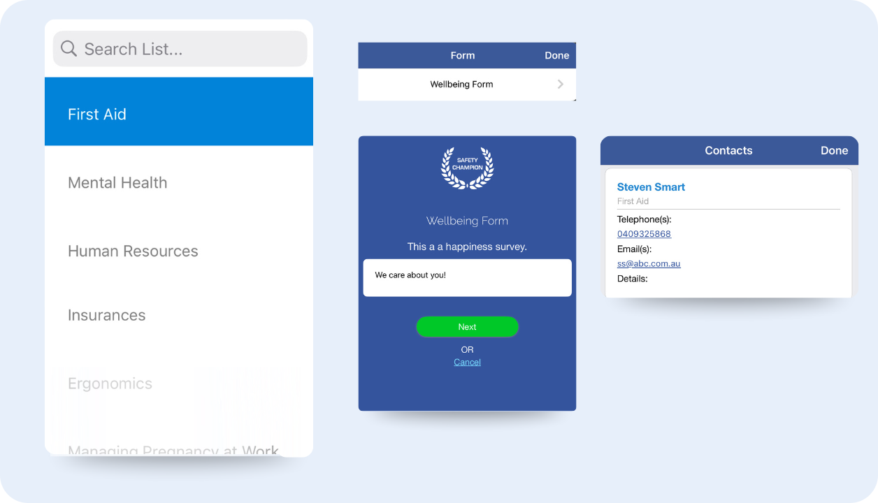 - Set permissions to specific users or workplaces to display relevant Collate and share information on topics like Mental Health, First Aid, Hazard Alerts, and Safety Work Practices.